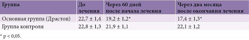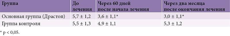 На фоне лечения пациенты обеих групп отмечали некоторое уменьшение боли и улучшение состояния, но в группе больных, получавших Драстоп, выраженность положительных сдвигов была более выраженной (табл. 1). Лечебный эффект препарата проявлялся уже в конце курса инъекционной терапии и продолжал нарастать в течение двух месяцев после окончания лечения.